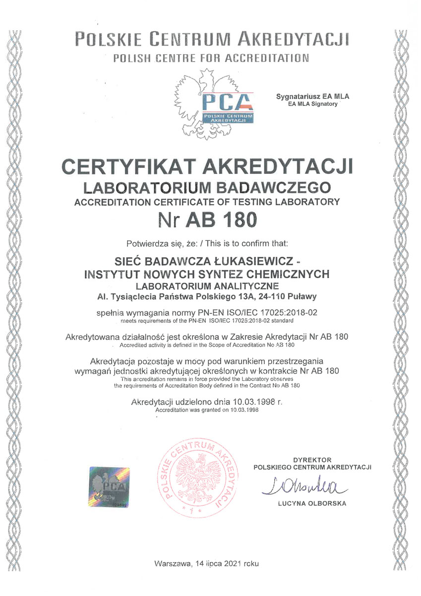 - CERTYFIKAT AKREDYTACJI LABORATORIUM BADAWCZEGO NR AB180