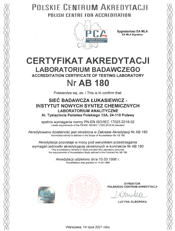 Laboratorium Analityczne Łukasiewicz – INS od 25 lat posiada akredytację Polskiego Centrum Akredytacji – AB 180 – w zakresie pobierania próbek oraz badania składu chemicznego i własności fizykochemicznych nawozów i surowców roślinnych.